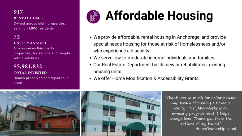 NeighborWorks Alaska provides affordable, quality, safe living environments for all Alaskans. From well appointed three bedroom units to practical efficiencies, we have apartments throughout Anchorage that are ideal for any lifestyle.